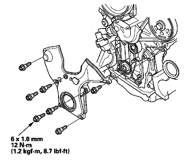 Mark the bolt head (D) and crankshaft pulley (E) as shown, then tighten the bolt an additional 60° (The mark on the bolt head lines up with the mark on the crankshaft pulley).