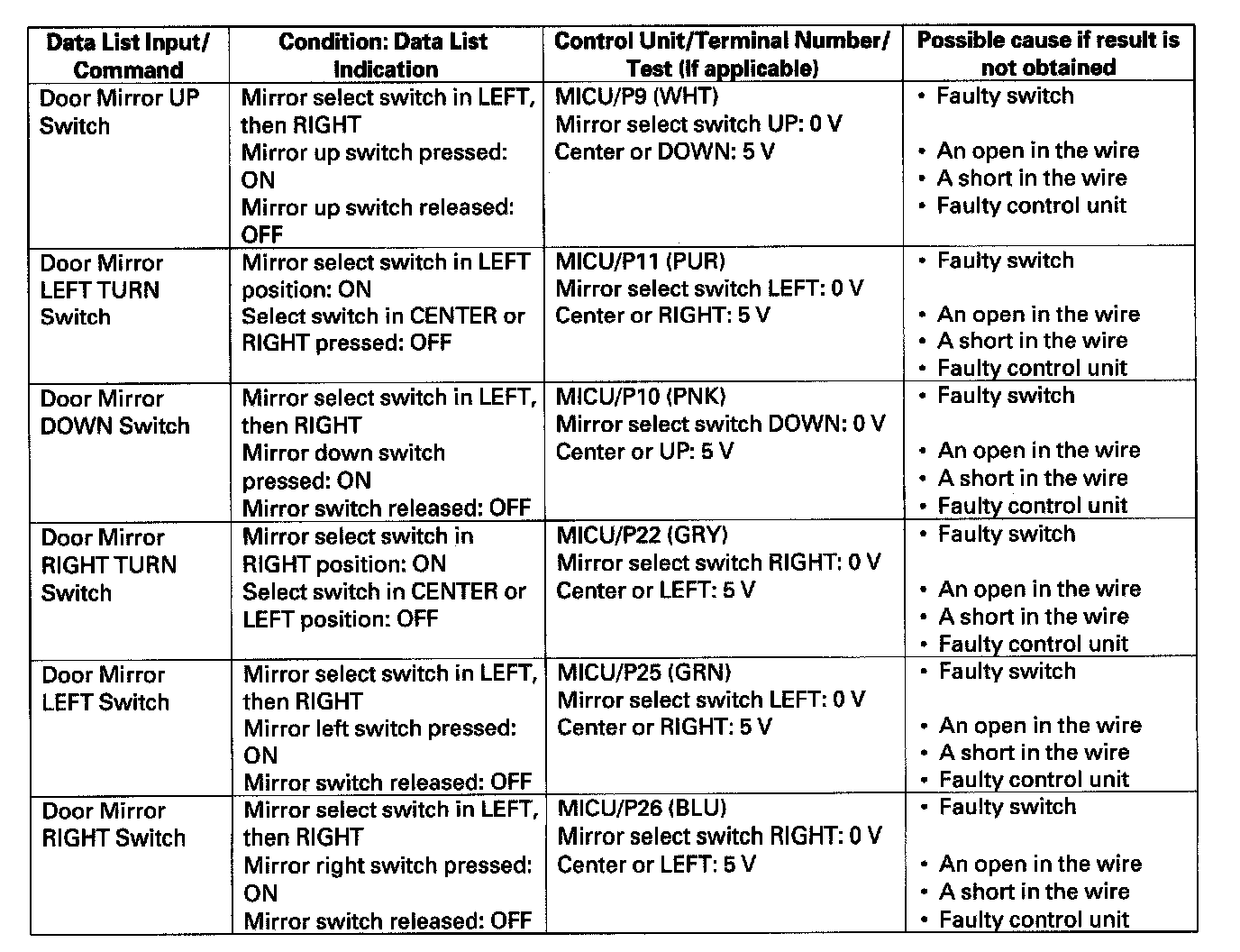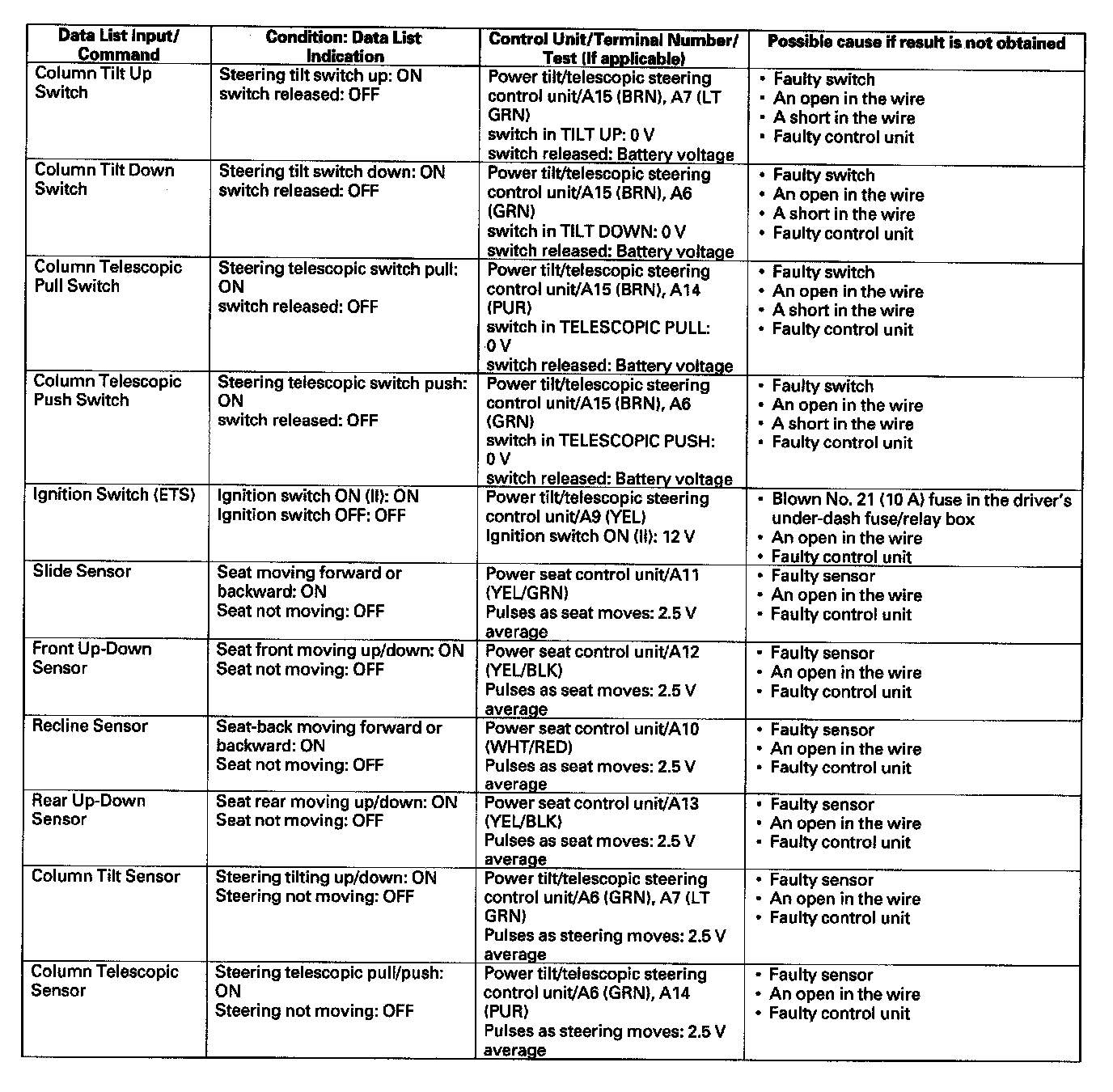 - If the data list indication is not correct, do the appropriate test at the control unit and terminal indicated in the table.