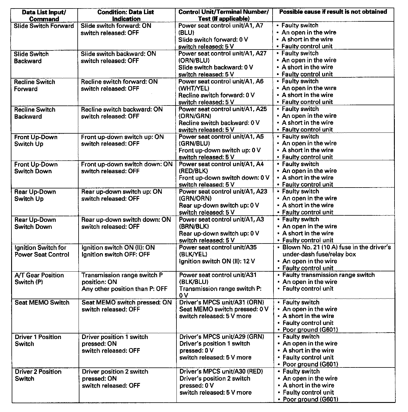 - If the function does not occur, do the appropriate test at the control unit and terminal indicated in the table.