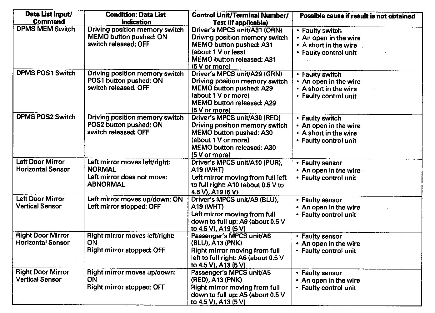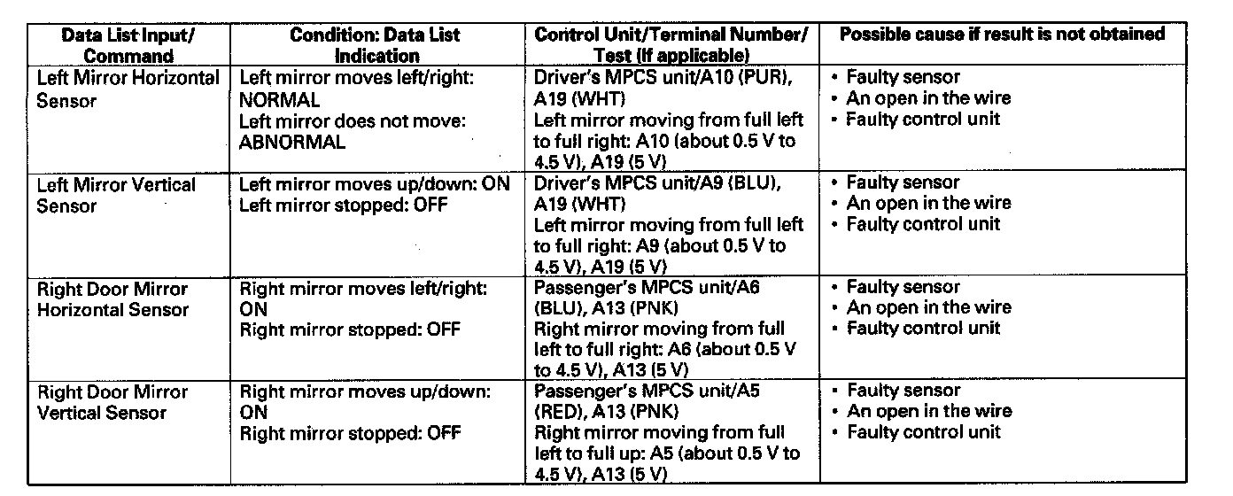- If the test indicates that the component does not operate normally, check for an open or short in the harnesses between the component and the control unit. If the harness is OK, replace the component.