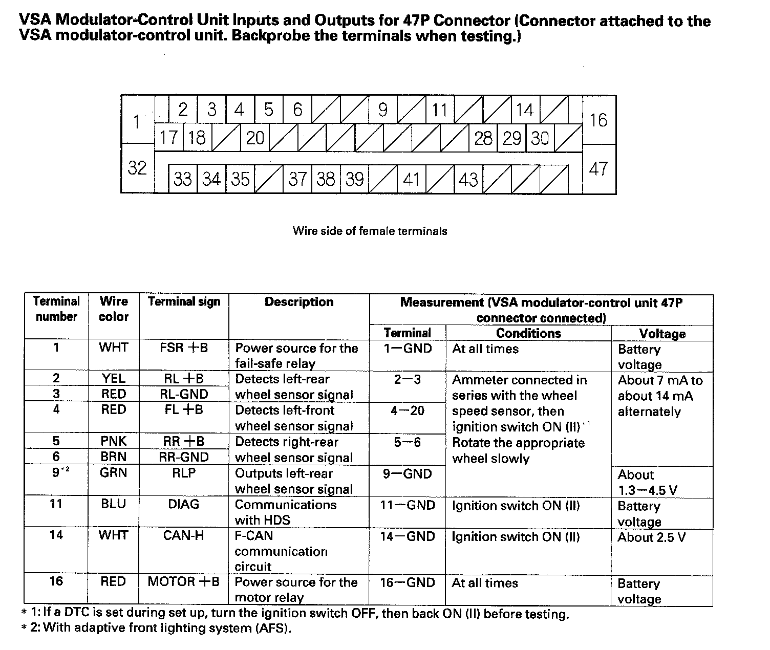 VSA Modulator-Control Unit Inputs And Outputs For 47P Connector (Connector Attached To The VSA Modulator-Control Unit. Backprobe The Terminals When Testing.)VSA Modulator-Control Unit Inputs And Outputs For 47P Connector (Connector Attached To The VSA Modulator-Control Unit. Backprobe The Terminals When Testing.) (Part 1):