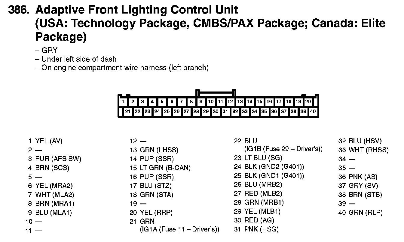 386. Adaptive Front Lighting Control Unit (USA: Technology Package, CMBS/PAX Package; Canada: Elite Package):