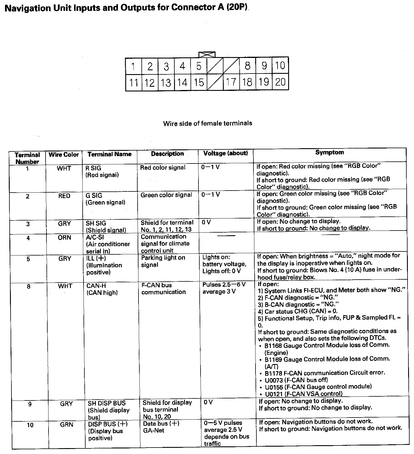 Navigation Unit Inputs And Outputs For Connector A (20P) Part 1: