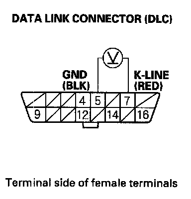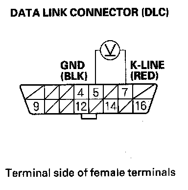 3. Measure voltage between DLC terminals No. 5 and No. 16.