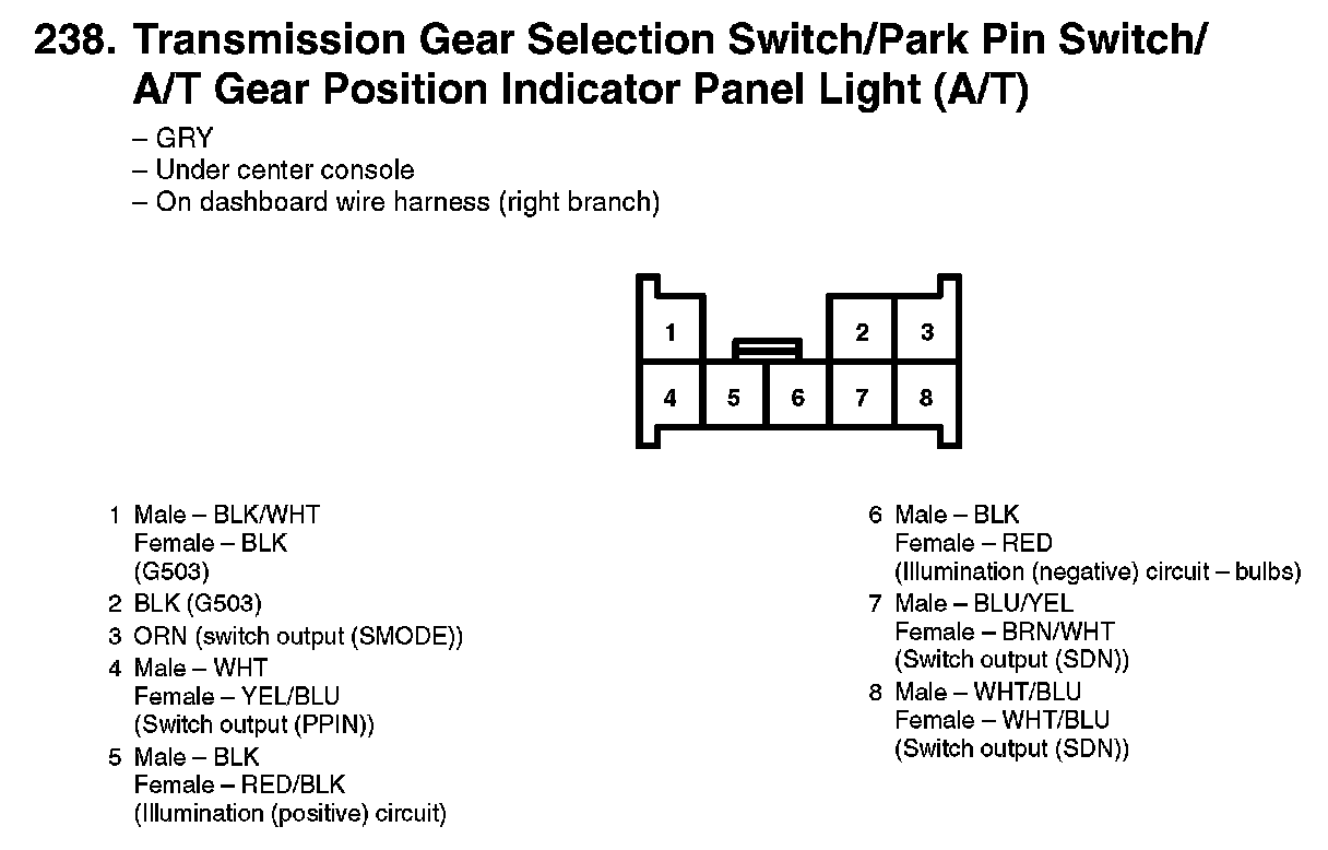 238. Transmission Gear Selection Switch/Park Pin Switch/A/T Gear Position Indicator Panel Light (A/T):