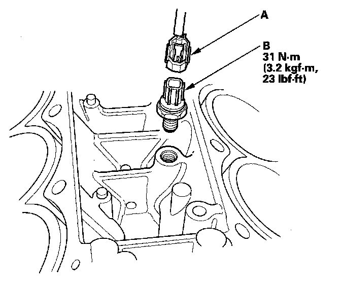 3. Disconnect the knock sensor connector (A), then remove the knock sensor (B).