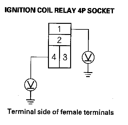 3. Measure the voltage between ignition coil relay 4P socket terminal No. 1 and body ground, then terminal No. 4 and body ground.