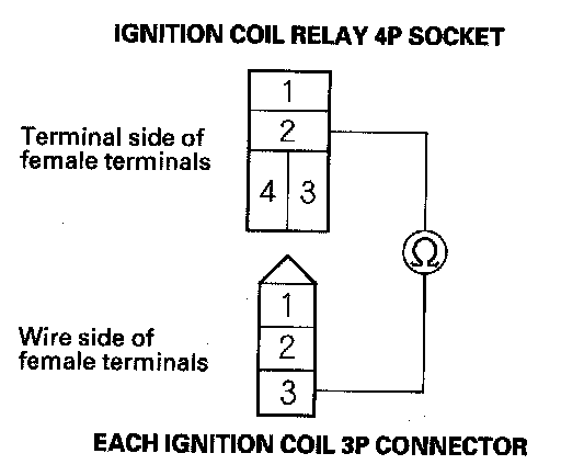 4. Check for continuity between ignition coil relay 4P socket terminal No. 2 and the each ignition coil 3P connector terminal No. 3.
