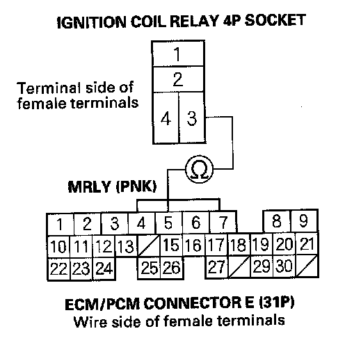 12. Check for continuity between ignition coil relay 4P socket terminal No. 3 and ECM/PCM connector terminal E5.