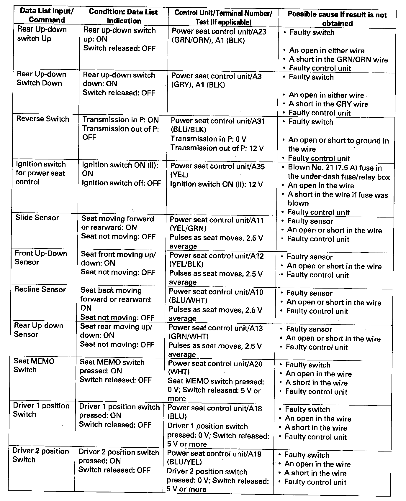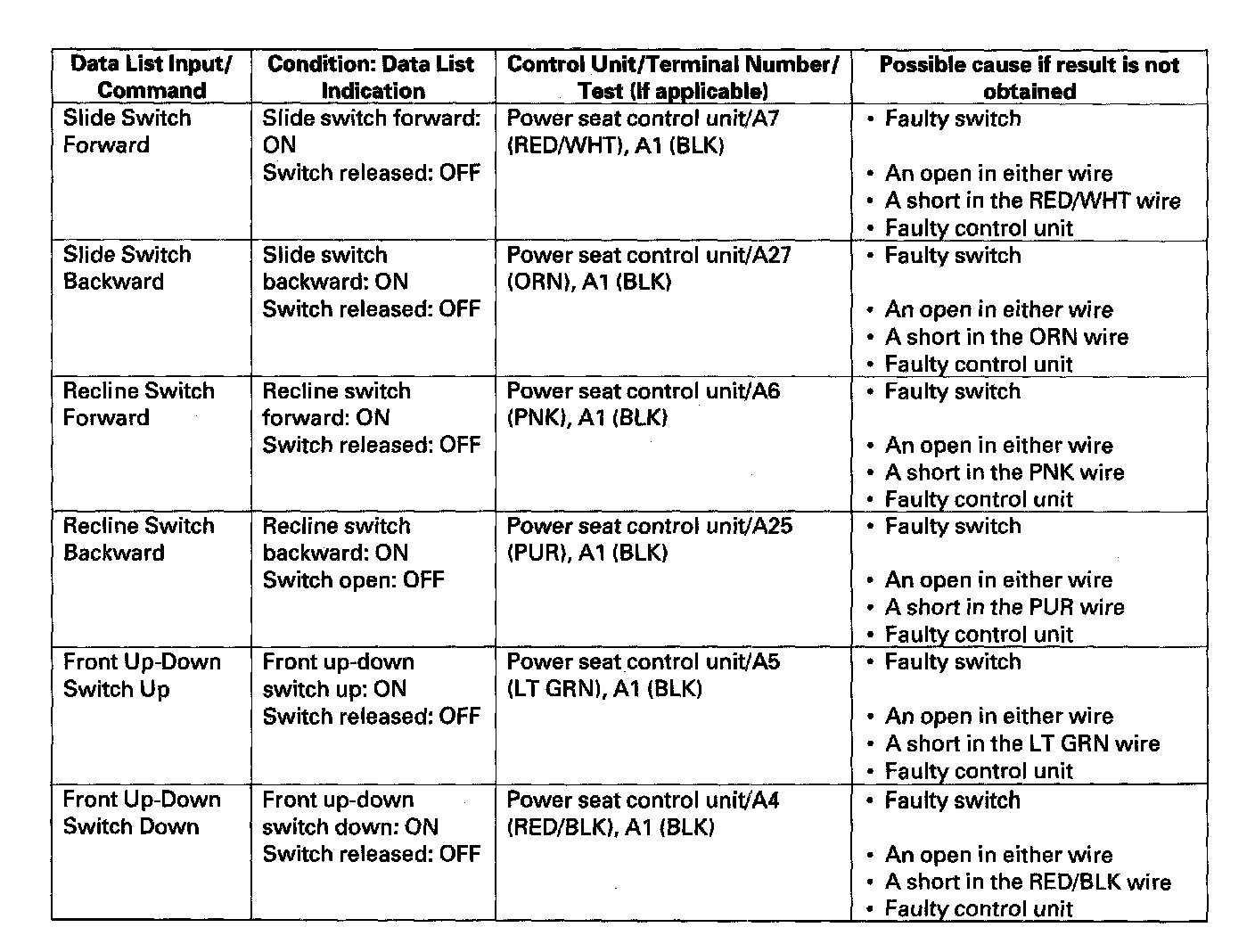 - If the data list indication is not correct, perform the appropriate test at the control unit and terminal indicated in the table.