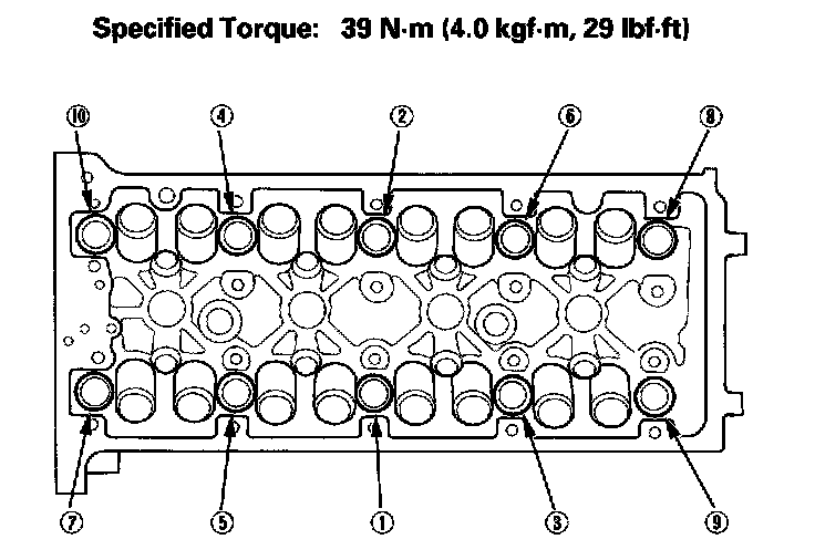 Tighten the cylinder head bolts in sequence 39 Nm (4.0 kgf-m, 29 ft. lbs.)
