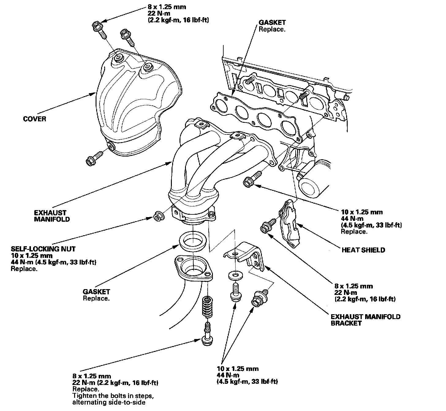 Install the exhaust manifold and tighten the bolts/nuts in a crisscross pattern in two or three steps, beginning with the inner nut.