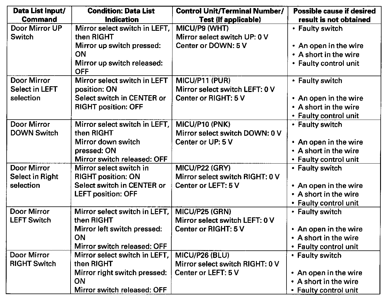 - If the data list indication is not correct, do the appropriate test at the control unit and terminal indicated in the table.