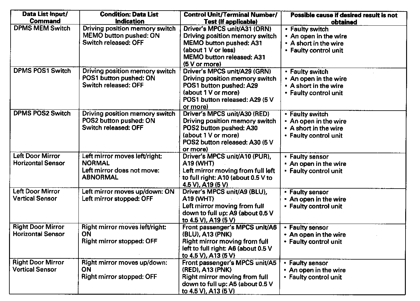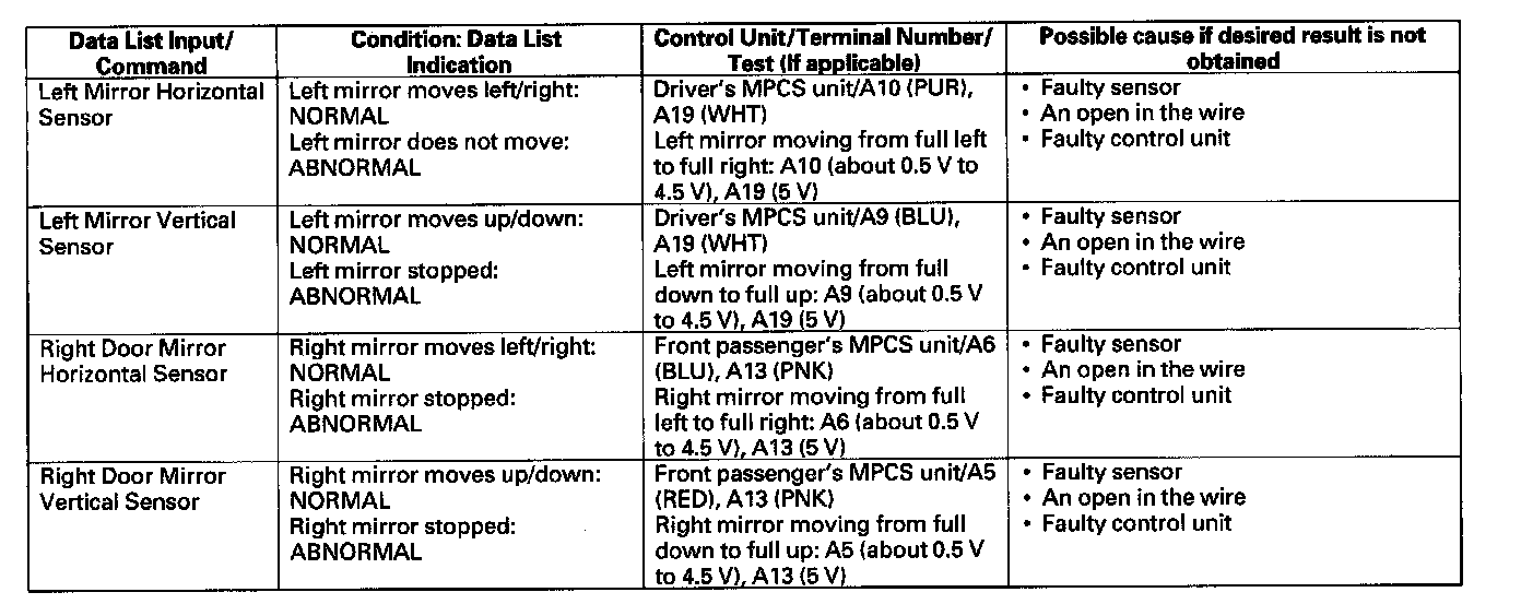 - If the test indicates that the component does not operate normally, check for an open or short in the harnesses between the component and the control unit. If the harness is OK, replace the component.
