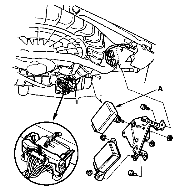 3. Remove the bolts from the bracket that holds the hands free link control unit, the throttle actuator control module, and the ACC unit (A).