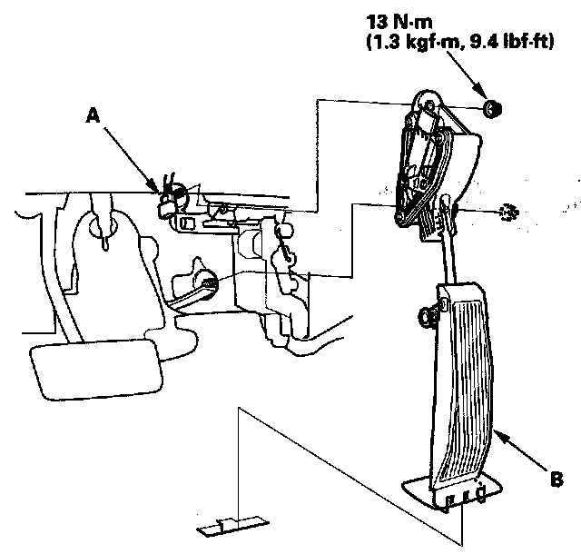 2. Release the lock tab on the base of the accelerator pedal, then remove the accelerator pedal module (B).