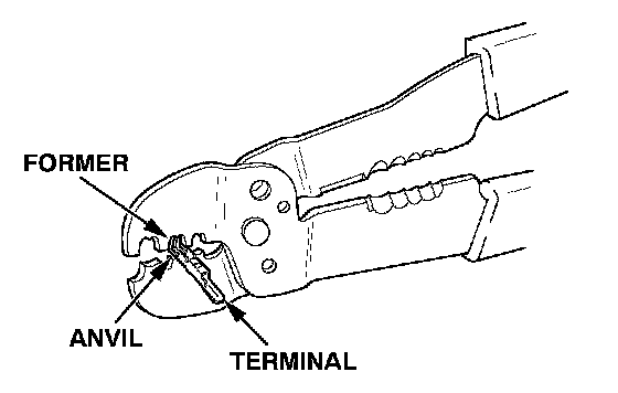 4. Position the terminal in the crimping tool slot with the solid portion of the terminal toward the anvil and the open section toward the former.