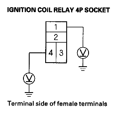 3. Measure the voltage between ignition coil relay 4P socket terminal No. 1 and body ground, then terminal No. 4 and body ground.