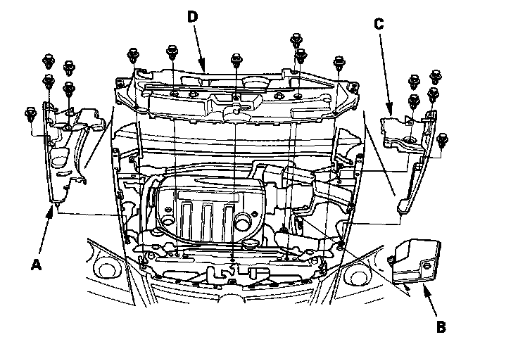 RFC Unit Replacement1. Remove the right upper fender trim (A), battery trim (B), left upper fender trim (C), then remove the upper grille cover (D).