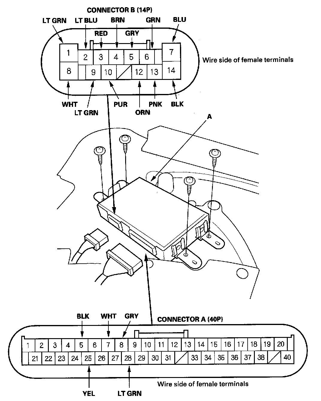 3. Disconnect driver's MPCS unit (A) connectors A (40P) and B (14P).