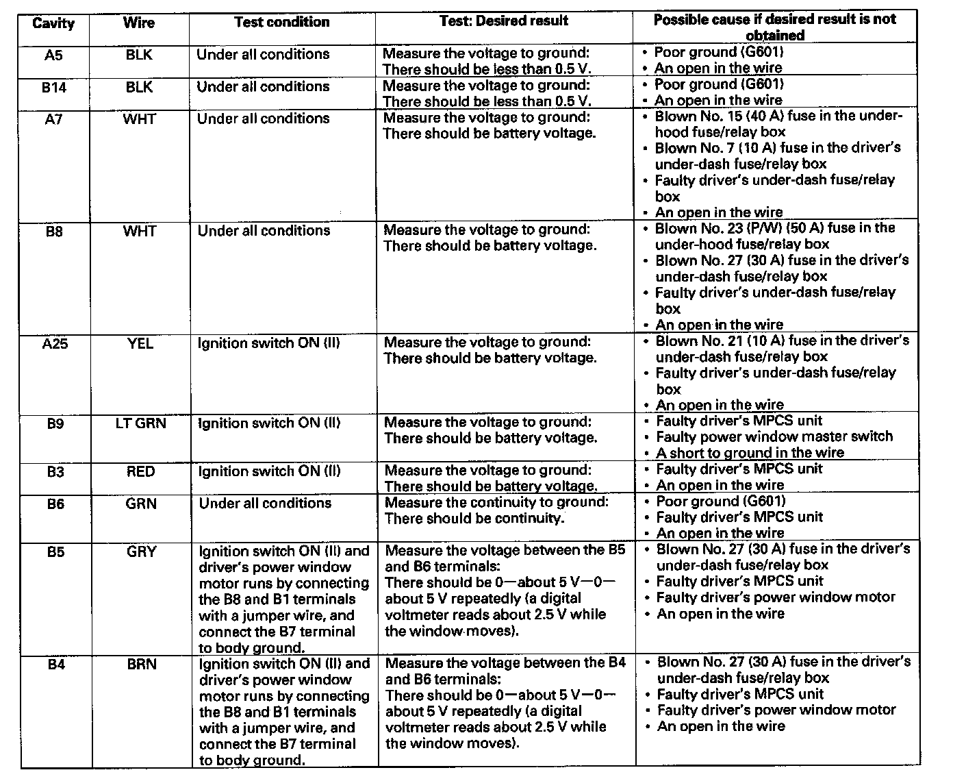 - If all the input tests prove OK, the control unit must be faulty; replace the driver's MPCS unit and go to step 7.