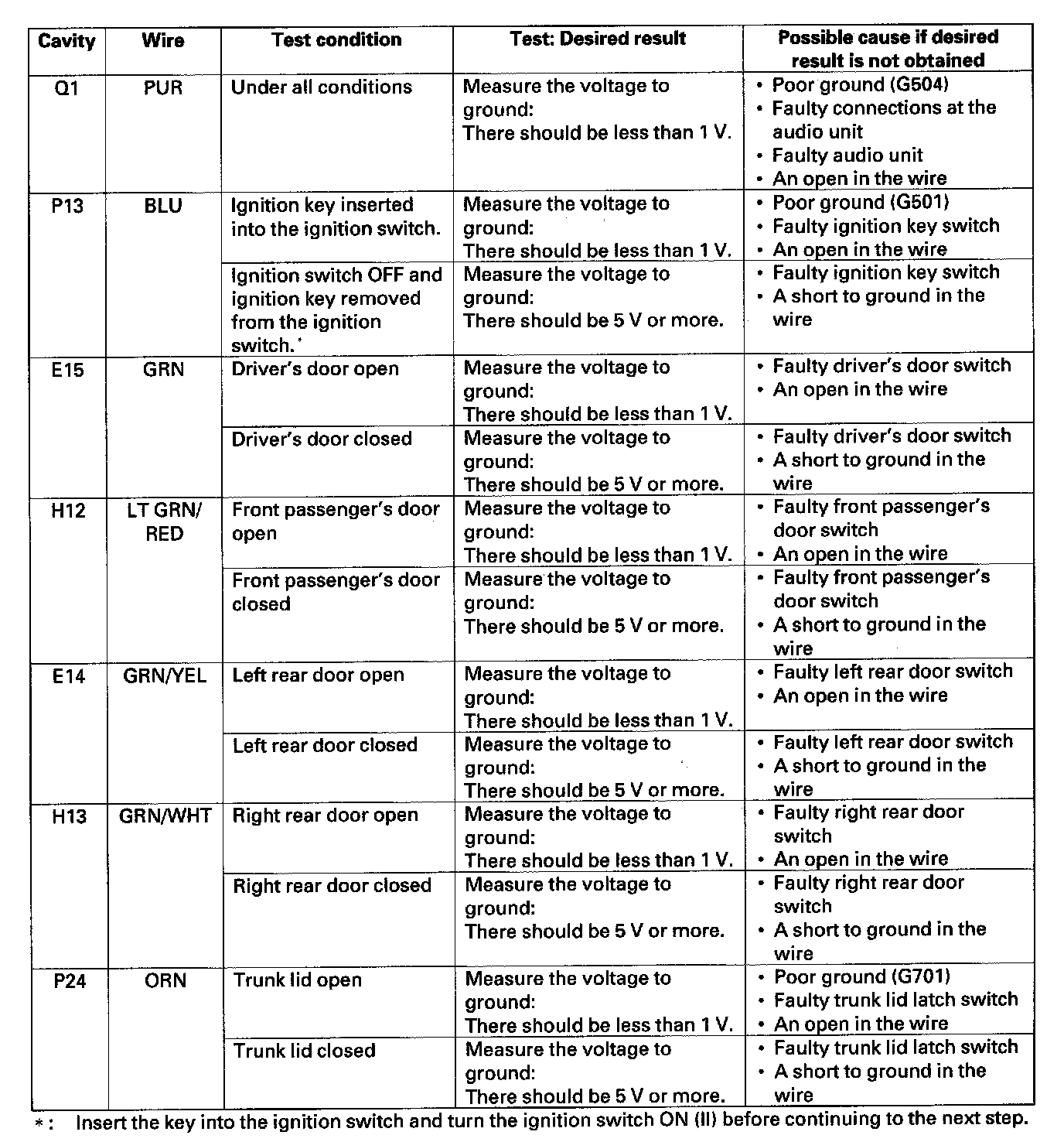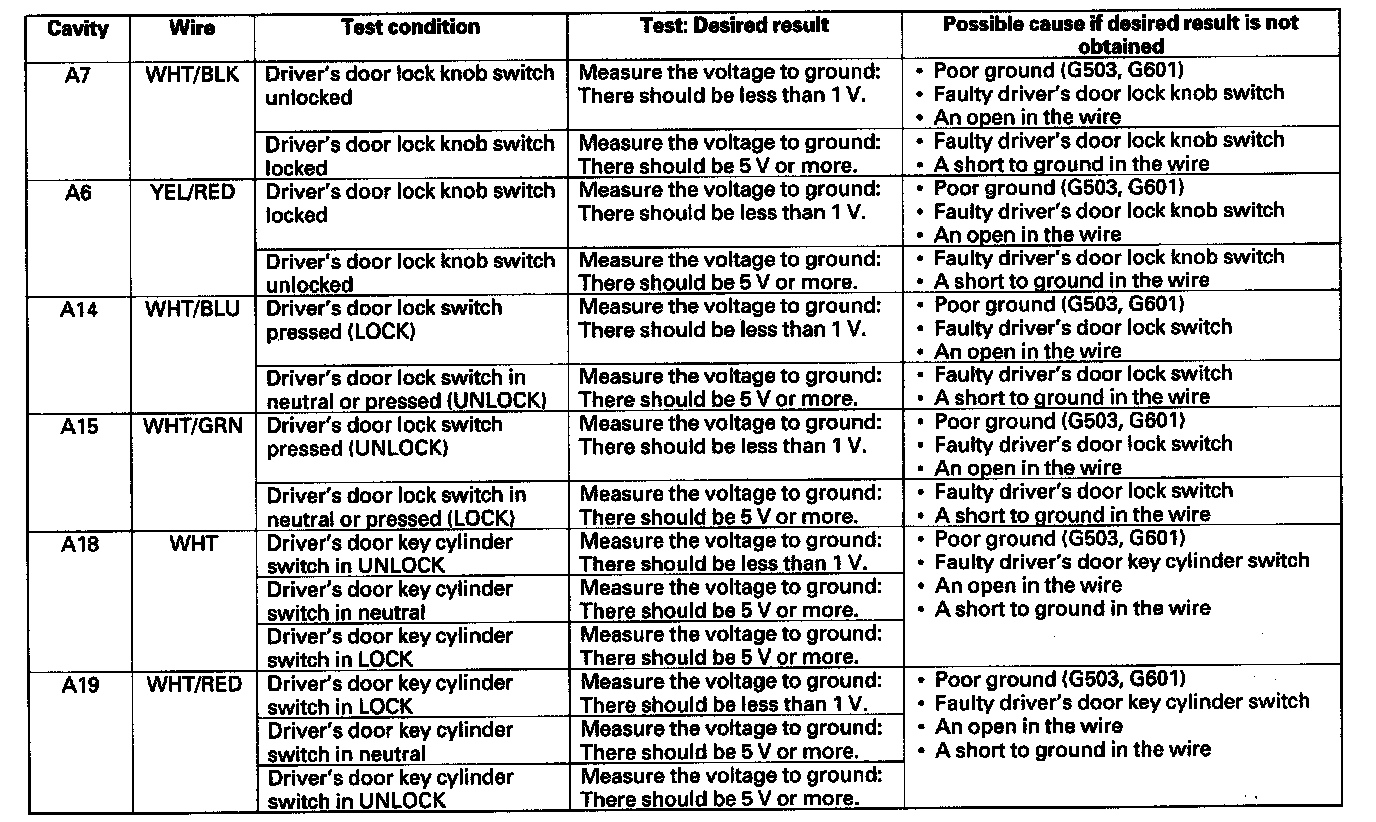 12. Reconnect the connector to the door multiplex control unit. Turn the ignition switch ON (II) and make these input tests at the connectors.
