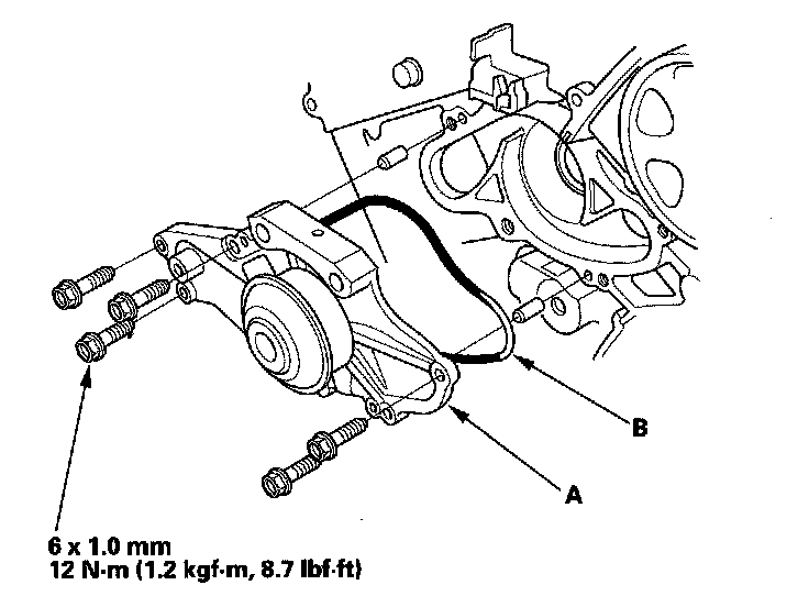 Install the dowel pins (B), then align the inner rotor with the crankshaft and install the oil pump (C).