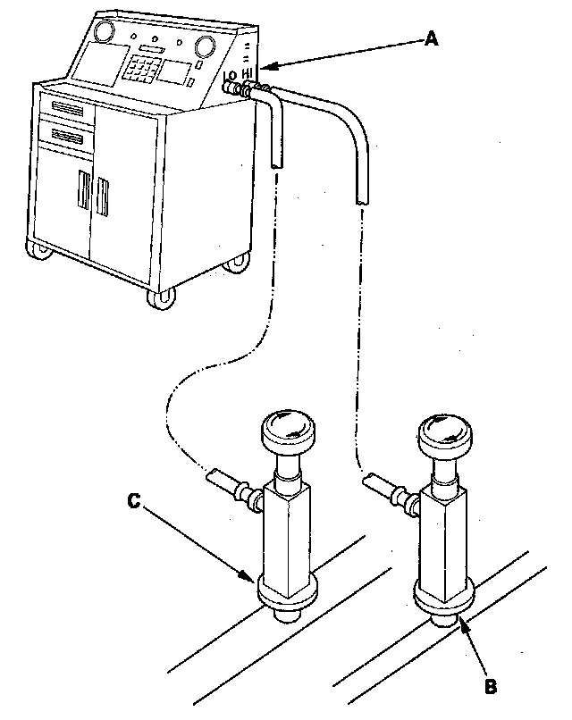 1. Connect an R-134a refrigerant recovery/recycling/charging station (A) to the high-pressure service port (B) and the low-pressure service port (C), as shown, following the equipment manufacturer's instructions.