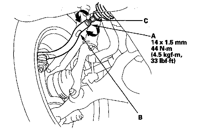 3. Loosen the tie-rod locknuts (A) while holding the flat surface sections (B) of the tie-rod end with a wrench, and turn both rack ends (C) until the front toe is within specifications.
