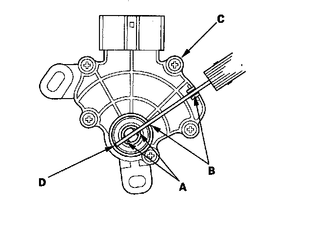 7. Align the cutouts (A) on the rotary-frame with the neutral positioning cutouts (B) on the transmission range switch (C), then put a 2.0 mm (0.08 in.) feeler gauge blade (D) in the cutouts to hold the switch in the N position.