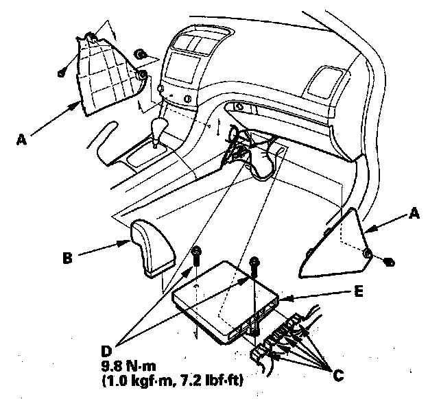 13. Remove the bolts (D), then remove the ECM/PCM (E).