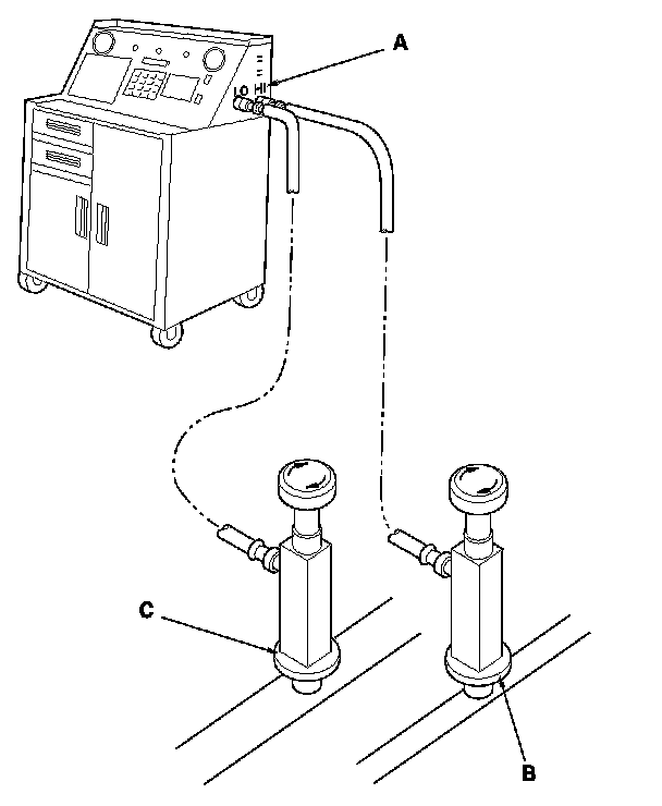 1. Connect a R-134a refrigerant recovery/recycling/charging station (A) to the high-pressure service port (B) and the low-pressure service port (C), as shown, following the equipment manufacturer's instructions.