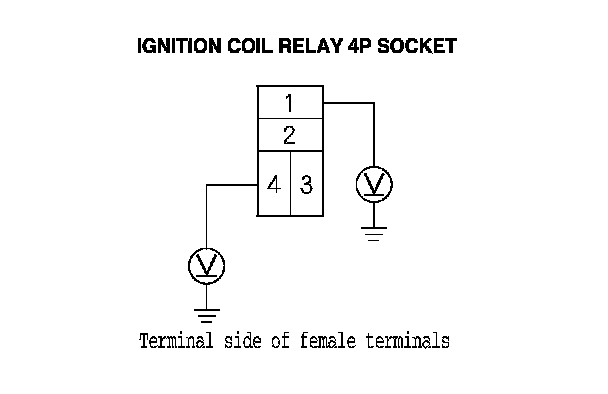 3. Measure the voltage between ignition coil relay 4P socket terminal No. 1 and body ground, then terminal No. 4 and body ground.
