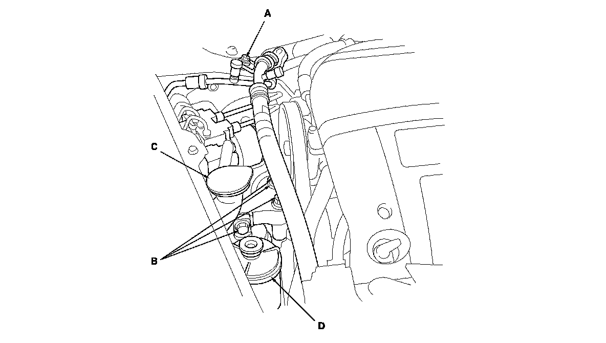 6. Remove the power steering fluid reservoir (D) bracket.