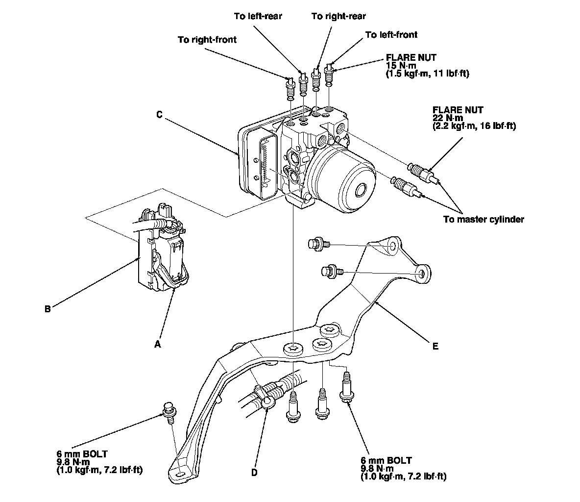 10. Remove the three 6 mm bolts, then remove the VSA modulator-control unit with bracket (E) from the body.