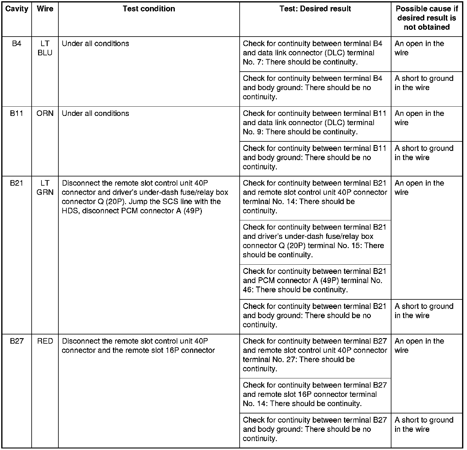 23. Reconnect the connector to the remote slot control unit, and do these input tests at the following connector.