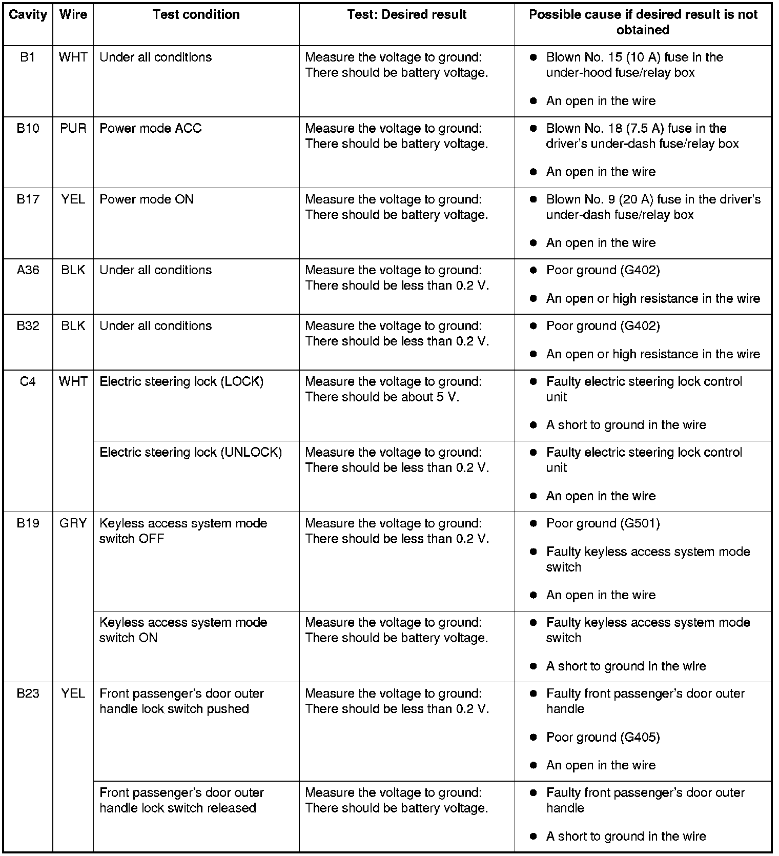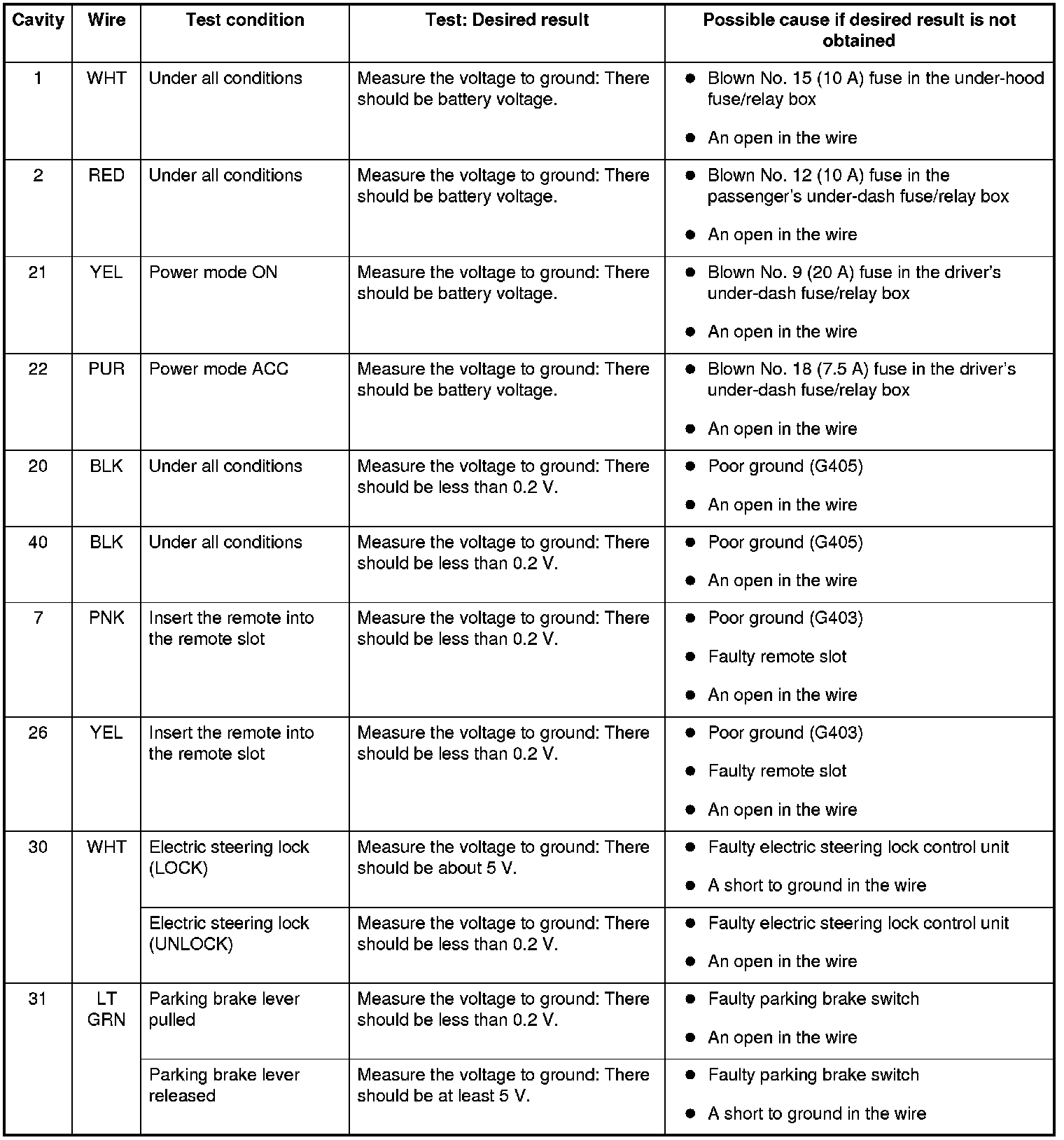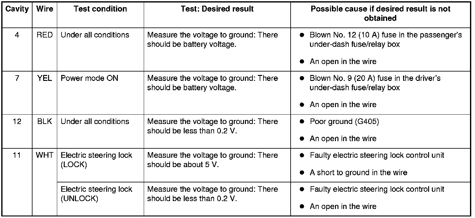 17. Reconnect the connector to the electric steering lock, and do these input tests at the following connector.
