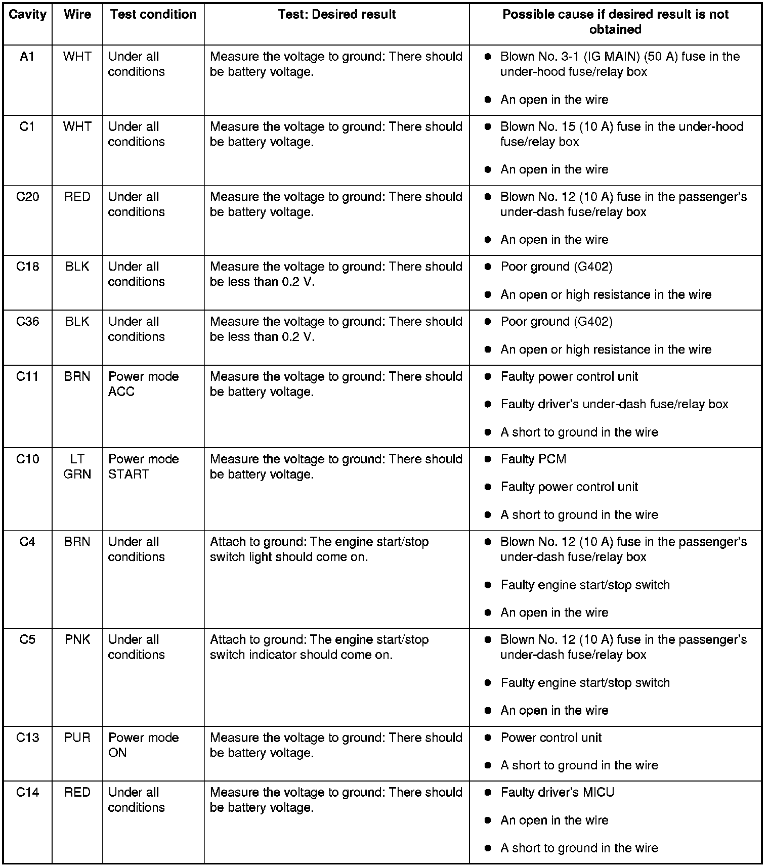 12. Reconnect the connectors to the power control unit, and do these input tests at the following connectors.