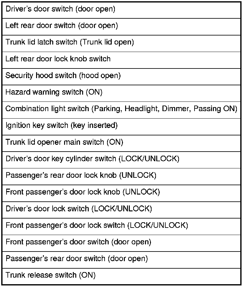 NOTE: If any control unit is faulty and will not wake up, several circuits in the system will malfunction at the same time. In the table below, is a list of the switches and the input signals that wake them up.