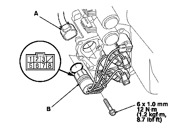 12. Disconnect the shift solenoid wire harness connector (A), then remove the shift solenoid wire harness (B) from the transmission housing.