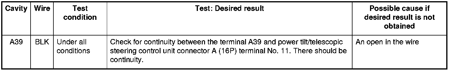 5. With the power seat control unit connectors still disconnected, disconnect power tilt/telescopic steering control unit connector A, and do these input tests at the following connectors.