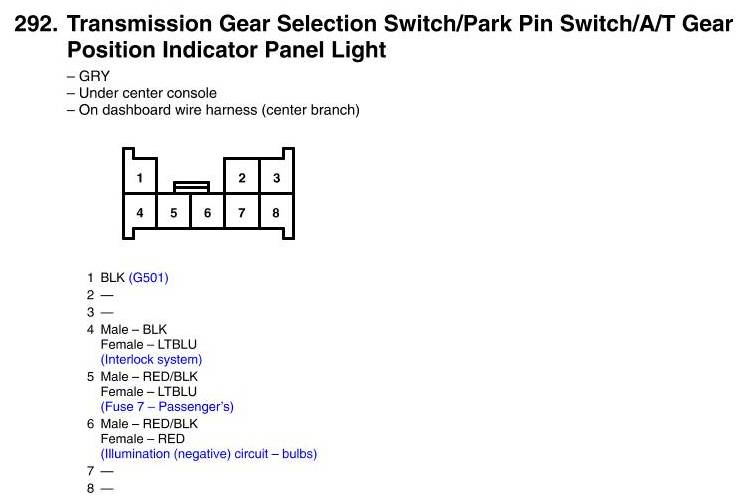 View 292 - Transmission Gear Selection Switch/Park Pin Switch/A/T Gear Position Indicator Panel Light Connector View