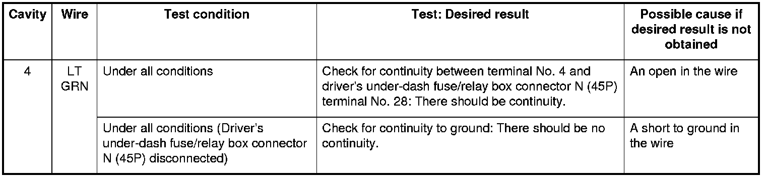 4. Reconnect the connector to the wiper/washer switch, and do these input tests at the following connector.