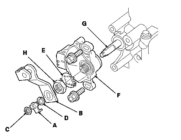 9. Pry the lock tabs of the lock washer (E) on the transmission range switch (F), hold the selector control shaft (G) with a 6.0 mm wrench, and loosen the locknut (H).
