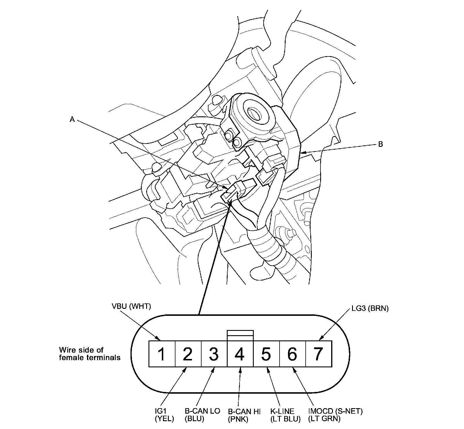 2. Disconnect the 7P connector (A) from the immobilizer-keyless control unit (B).