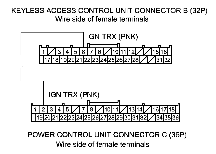 39. Check for continuity between keyless access control unit connector B (32P) terminal No. 6 and power control unit connector C (36P) terminal No. 2.