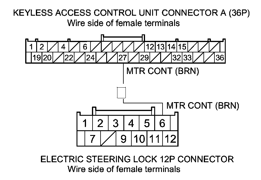 42. Check for continuity between keyless access control unit connector A (36P) terminal No. 27 and electric steering lock 12P connector terminal No. 6.