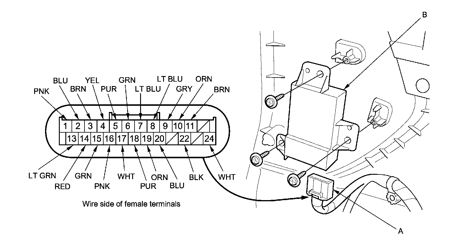 3. Disconnect the 24P connector (A) from the power mirror control unit (B).