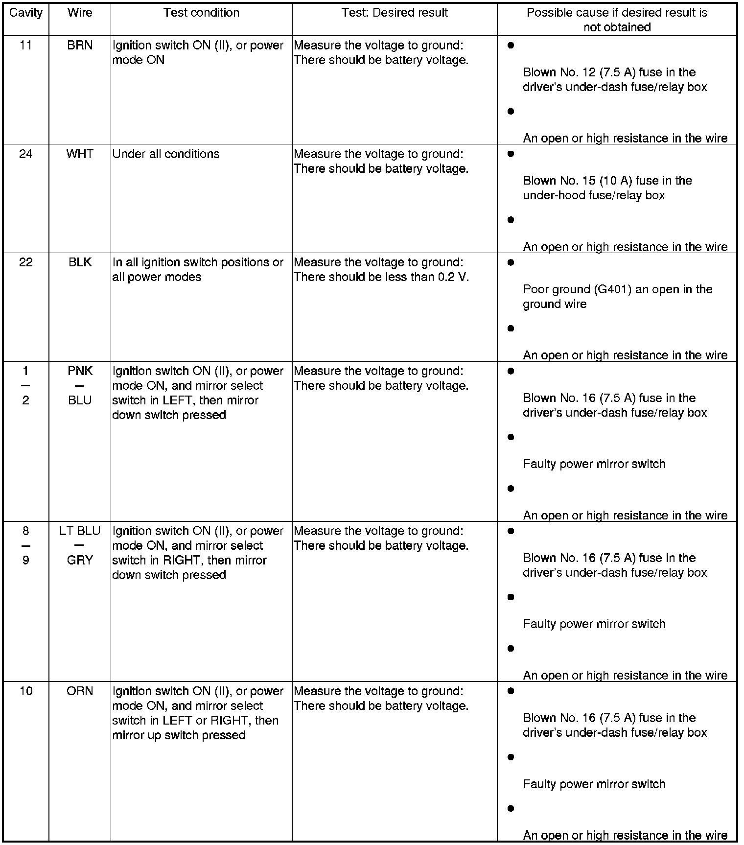 6. Turn the ignition switch to LOCK (0), or press the engine start/stop button to select the OFF mode, then disconnect the connectors from the power mirror control unit, and do these input tests at the following connectors.