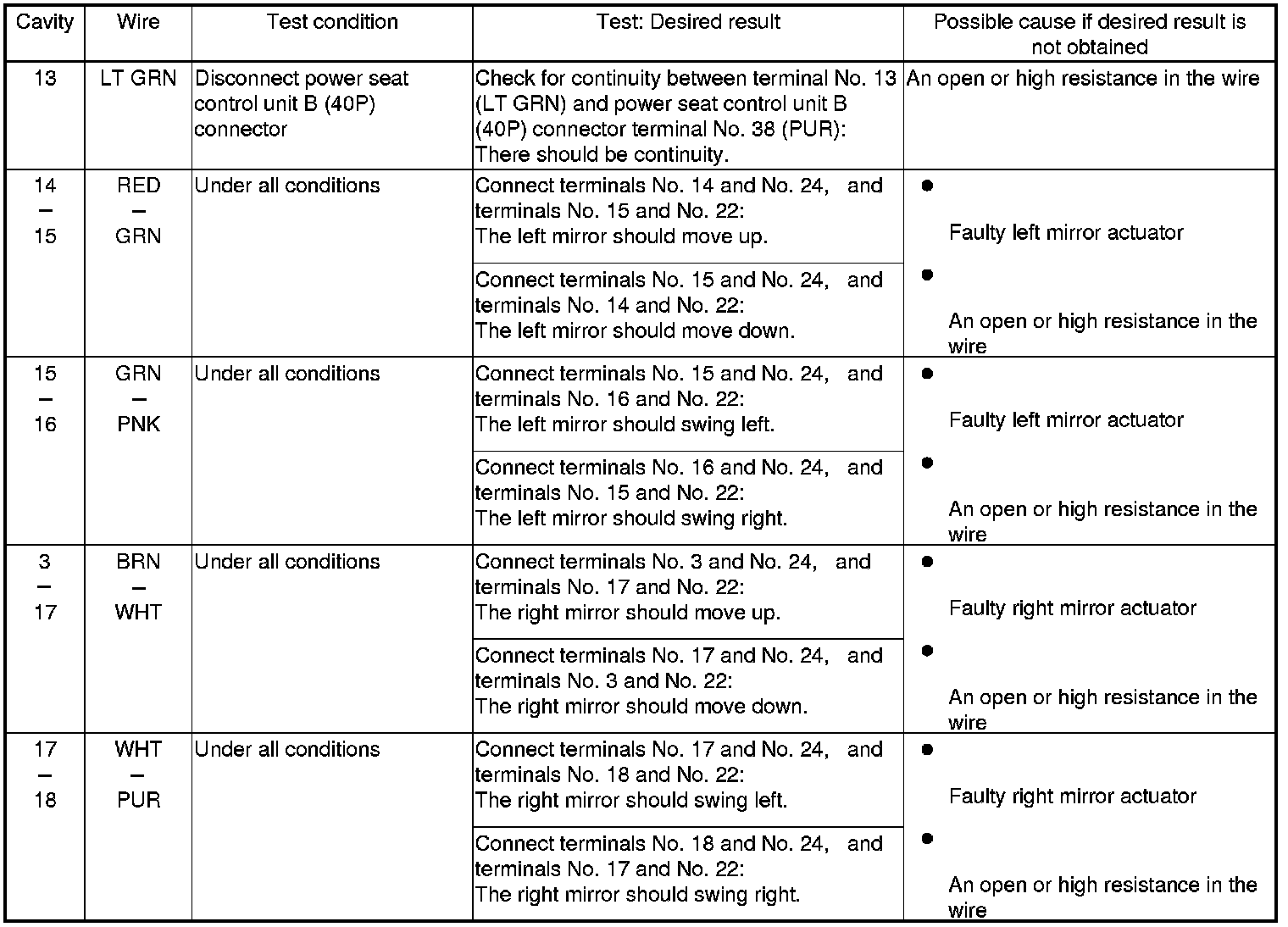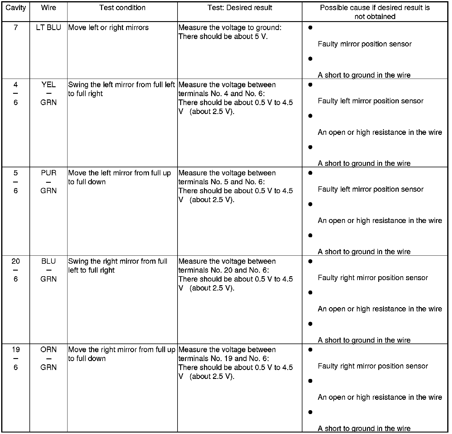 5. Reconnect the connector to the power mirror control unit, and do these input tests at the following connector.